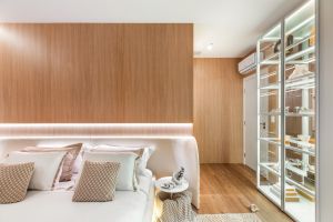 No projeto luminotécnico, a luz atua como recurso escultural e atmosférico. Retroiluminação em camas e painéis de madeira cria jogos de sombra e volume, enquanto pontos direcionados oferecem diferentes cenários — da leitura ao descanso. “A luz bem planejada proporciona aconchego, valoriza as texturas e dá vida à decoração”, destaca.